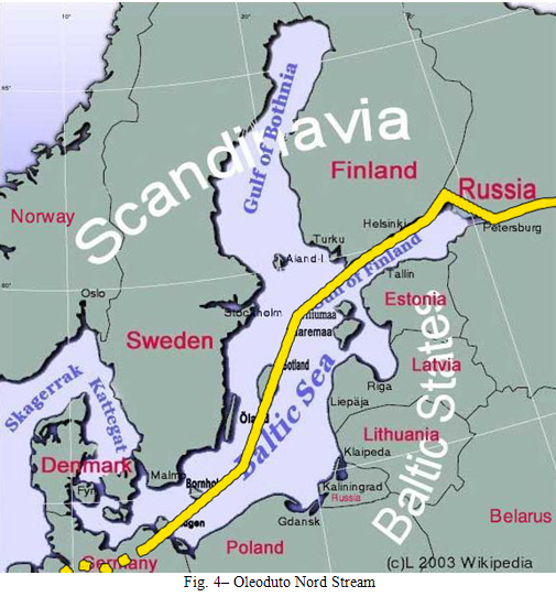 Putin e a Gazprom lançaram também um projecto, envolto em controvérsia, de um gasoduto (Nord Stream) sob o mar Báltico directamente para a Alemanha (Ver Fig. 4). Claro que cortar o abastecimento de gás à Alemanha seria muito mais problemático do que fazê-lo à Ucrânia, mas seria possível. Os países da região opuseram-se ao projecto, justificando essa posição pelos danos ecológicos que traria ao já muito poluído Báltico. A Suécia e a Estónia defendem que o projecto tem de ter a aprovação de todos os países cujo território fosse atravessado pelo gasoduto e, por esta razão, o projecto foi adiado no mínimo por um ano. A Suécia opõe-se também por desconfiar que a Rússia utilizará o gasoduto para instalar equipamentos subaquáticos para escutas secretas de comunicações.