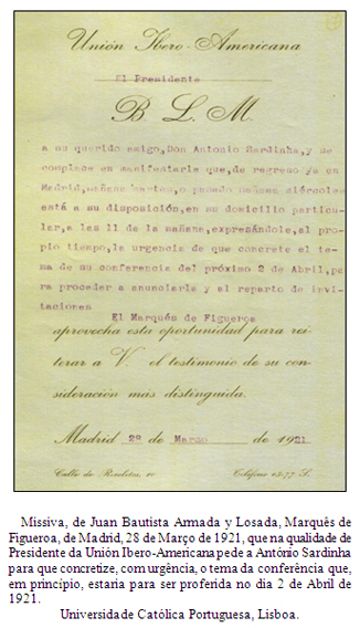 Missiva, de Juan Bautista Armada y Losada, Marquês de Figueroa, de Madrid, 28 de Março de 1921, que na qualidade de Presidente da Unión Ibero-Americana pede a António Sardinha para que concretize, com urgência, o tema da conferência que, em princípio, estaria para ser proferida no dia 2 de Abril de 1921. Universidade Católica Portuguesa, Lisboa.