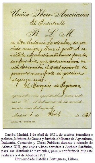 Cartão, Madrid, 1 de Abril de 1921, do escritor, jornalista e político, Ministro de Gracia y Justicia e Minstro de Agricultura, Industria, Comercio y Obras Públicas durante o reinado de Afonso XIII, que envia vários convites a António Sardinha, para sua distribuição particular, para a conferência que este realizará a 4 de Abril de 1921.
