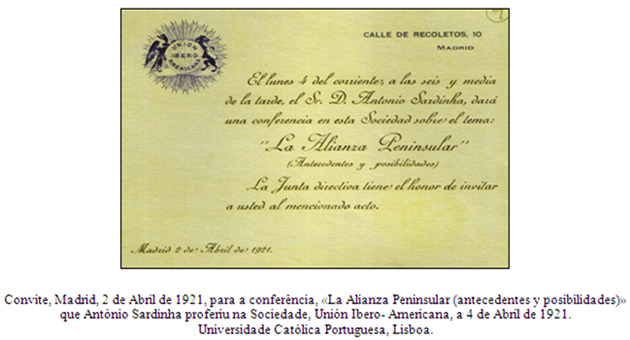 A Aliança Peninsular - Antecedentes e Possibilidades (1924) no entanto, este plano de política internacional que António Sardinha propõe, recordemos, remonta a 1915 como alternativa à União Ibérica e correlatas doutrinas iberistas combatidas nas Conferências da Liga Naval, permanecendo sempre presente visto que, para o ensaísta,