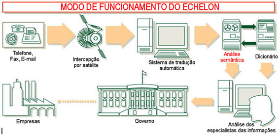 Esses poderosos computadores possuem aplicações que efectuam o reconhecimento de voz e reconhecimento de caracteres ópticos (OCR), procu­rando na informação interceptada palavras ou frases constantes em listas designadas por “dicionários” do ECHELON. Estes “dicionários” são pré-esta­belecidos, consoante o tipo de pesquisa que se pretende efectuar. Sempre que os sistemas informáticos detectam uma palavra do “dicionário” executam uma gravação da mensagem para posterior análise e processamento. Os analistas das informações, em cada uma das estações de escuta, mantêm as listas das palavras-chave de que foram encarregados de analisar, enviando posteriormente as matrizes de informação encontrada à agência que solicitou tal pesquisa. Esta actividade pode ser graficamente representada pela figura se­guinte.