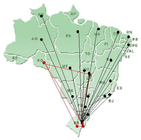 A figura 2 mostra uma visão geral do sistema onde os pontos vermelhos são as OSAs que estão integradas e que compartilham informações de seus inspecionados, com exceção do diagnóstico que aparece criptografado. E, os pontos pretos são as demais organizações militares conectadas a Intraer que podem usufruir das informações disponibilizadas pelas Juntas de Saúde, em tempo real.