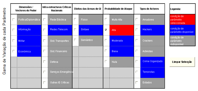 [19]. Assumindo que o risco social é determinado não só com base na severidade (nível de impacto) mas também pela probabilidade de ocorrência de um ataque, importa essencialmente fazer face à situação “mais provável e acautelar a situação mais perigosa”. A partir da ferramenta computacional desenvolvida, foi possível visualizar graficamente os parâmetros associados a todos os cenários e obter a intersecção destes dois “espaços-solução”. De acordo com os dados obtidos, a estratégia mais consistente e eficaz passa por uma aposta na protecção das redes de telecomunicações (IIN) do Estado. Este passo, constituiu o culminar de todo o processo de análise morfológica desenvolvido, permitindo definir a “melhor estratégia possível” para reduzir o risco social na exploração do ciberespaço.