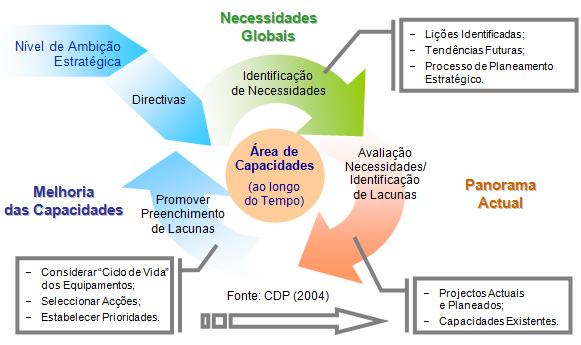 Caracterizada a situação e traçado o panorama actual, o passo seguinte é o de promover o preenchimento das lacunas, tendo em vista a melhoria das capacidades existentes. Para tal, torna-se necessário seleccionar acções e estabelecer prioridades, considerando o “ciclo de vida” dos equipamentos e outros factores (materiais e não materiais), não só a curto mas também a médio e longo prazo. Estas acções vão influenciar a situação actual e as capacidades existentes, realimentando o “ciclo de desenvolvimento de capacidades” com novos dados de planeamento que, inevitavelmente, acabam também por influenciar as tarefas a desenvolver no âmbito operacional. O PDC, encontrando-se alinhado com a Estratégia da Informação Nacional, vai permitir enquadrar e dirigir o esforço colectivo de desenvolvimento de capacidades de forma estruturada, identificar oportunidades de cooperação, orientar tanto as actividades de Investigação e Desenvolvimento (I&D) apoiadas pelo Estado como as desenvolvidas pela própria Indústria Nacional, fornecendo métricas que permitam avaliar o progresso relativo de todo o processo.