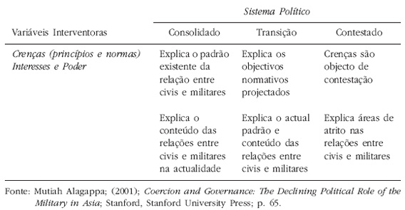 Nesta parametrização, a nossa preocupação centra-se primordialmente com a análise dos processos de liderança, especialmente os indivíduos e grupos que formulam e executam as políticas que pautam o relacionamento entre civis e militares. No entanto, não deixaremos de analisar, ainda que num contexto mais generalista, a ligação entre coerção (que inclui, mas não se limita ao emprego da força) e governação (entendida como a construção e reforço institucional da nação e do Estado, a estrutura e o processo de dominação política, a manutenção da ordem interna, e a salvaguarda da segurança internacional do Estado). Esta abordagem assenta na premissa de que a ligação entre o militar e o Estado é tanto maior quanto maior for o peso coercivo da governação (uma questão que julgamos merecer uma investigação mais apurada na área da política comparativa).
