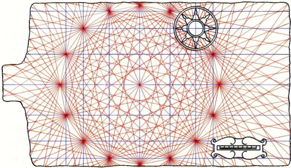 Fig. 4 - Rede de linhas de rumo, rosas-dos-ventos e tronco das léguas numa carta-portulano6