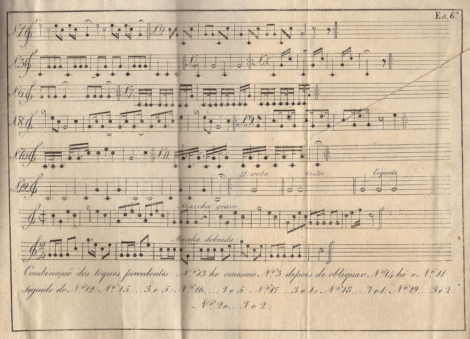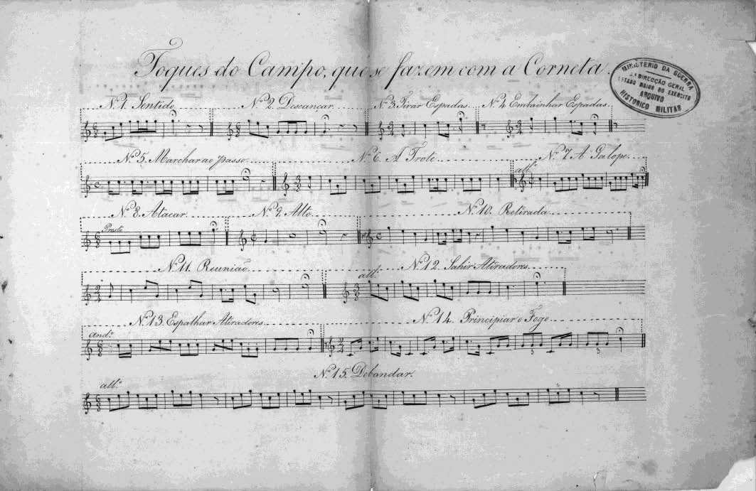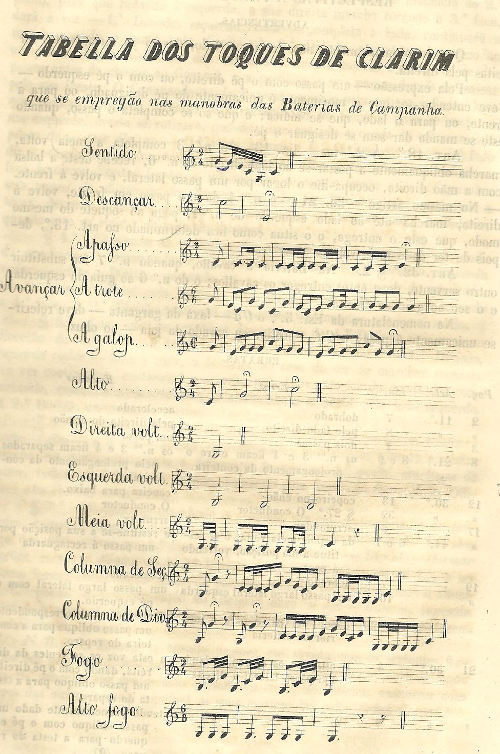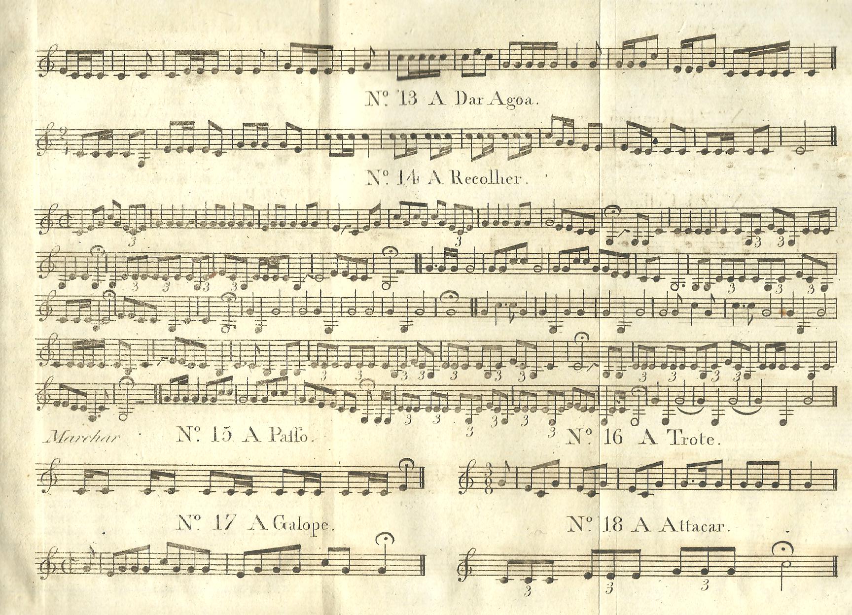 No Arquivo Histórico Militar encontramos ainda outro documento com “Toques do Campo que se fazem com a Corneta” para a Cavalaria, onde podemos observar um conjunto de 28 toques de campanha para clarim, com diversos sinais para indicar o tipo de passo a adoptar, “Passo”, “Trote” ou “Galope”, o sinal de “Atacar”, “Retirar”, “Fazer-fogo”, “Cessar-fogo”, “Apear” etc. Além destes 28 toques para uso em situação de campanha, o documento tem ainda outros 25 toques de quartel para clarim, desde os sinais indicativos de “Alvorada”, “Rancho”, “Recolher” até marchas para continências como a “Marcha a Estandartes” e a “Marcha de Guerra”17.