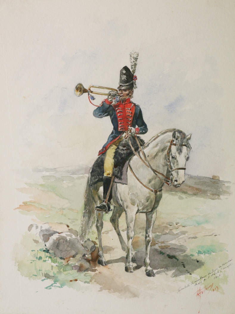 Antes desta regulamentação de 1816, as Instruções Provisórias para a Cavalaria de 181034 já referiam a missão dos clarins quer em operações quer no cerimonial, indicando que quando o Regimento de Cavalaria formava para prestar continência, os clarins tocavam o toque de continência enquanto o estandarte do regimento fazia a continência e durante a revista: “A música e os clarins tocão música alegre, ou fanfarras durante a Inspecção.”35 o que nos dá indicação da existência de um agrupamento musical além dos clarins revelando ainda que os clarins desfilavam montados em cavalos, tal como actuavam nas operações, como demonstra o quadro orgânico, que indica que o trombeta mor e os trombetas das companhias tinham cavalo distribuído.
