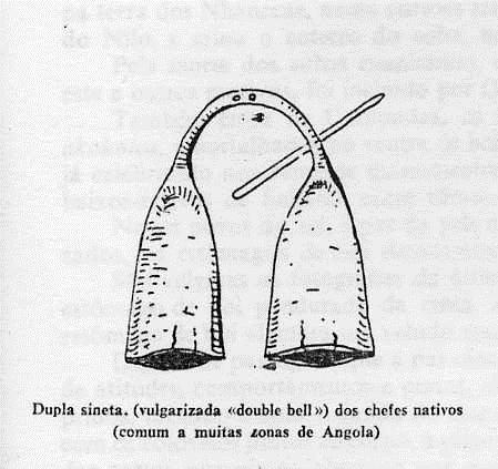 Presumo tratar-se do lumbembe referido por José Redinha6: “ (…) No número de peças privativas dos chefes, e em muitos aspectos simbolistas da sua autoridade e presença, contam-se alguns instrumentos musicais. E assim, embora sem significado de insígnia ou emblemática, devemos considerar uma conhecida e muito divulgada peça, espécie de sineta geminada, constituída por duas campânulas de ferro achatadas, ligadas entre si. Incorporam estes instrumentos por um semi-arco do mesmo metal, tudo constituindo uma peça solidária. No leste angolano é designado Lubembe. É percutida por com um ponteiro de madeira, alternadamente nas duas campânulas… Anuncia a aproximação do chefe (…).”