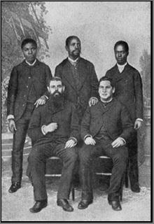 Sentado à esquerda o missionário Barroso, à sua direita o missionário José Pereira, e em pé dois filhos e um sobrinho do rei do Kongo