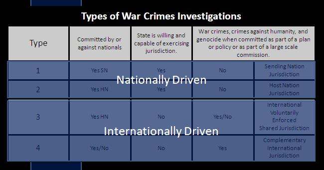 • Type 1 (Sending Nation Jurisdiction) – The first type refers to war crime investigations of acts committed by or against a member of friendly military forces or any other special circumstances requiring further inquiry. This type of investigations is mainly a national responsibility or, where it involves personnel of more than one nationality, is to be carried out jointly with another State. It also represents the willingness and the ability24 of a State to exercise its criminal jurisdiction;