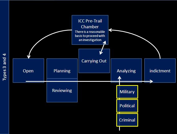 • Type 4 (Complementary International Jurisdiction) – The fourth type includes large scale war crimes, crimes against humanity and genocide, especially when committed as part of a plan or policy, or as part of a large-scale commission and the Host State displays neither willingness nor the ability to promote justice. Likewise, this sort of investigations is carried out under the responsibility of an international body, which jurisdiction is attributed by an international legal instrument and executed by the United Nations or the Prosecutor of an International Tribunal.