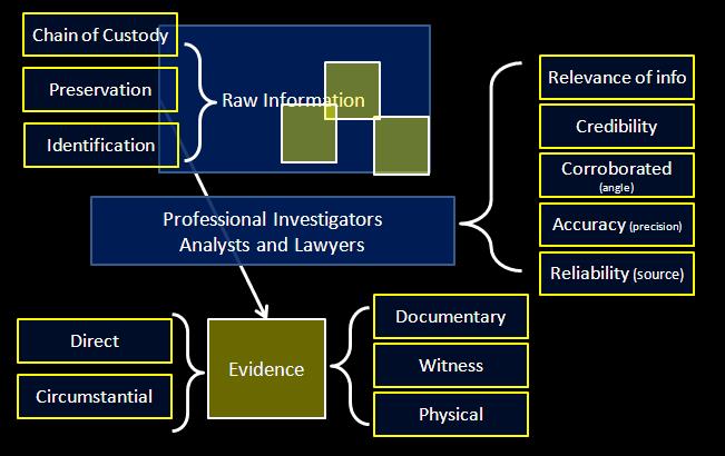 – Preservation and analysis of evidence – It is important to avoid confusing the two separate concepts of information and evidence. The distinction between these two is very important in international criminal justice. Anyone can collect information, and much of it may be useful later for international criminal courts. Ultimately, however, only professionally trained employees of international courts or personnel appointed by special courts are in a position to determine what information is eventually to be submitted as evidence in cases. Not all information necessarily becomes evidence, but all evidence is information50. Thus, one of the key aspects when dealing with evidence is the maintenance of the chain of custody51. Information should be preserved, controlled and accurately identified (labeled). The source identification in one of the main concerns due to the court admissibility requirements52. Evidence is regularly organized into three groups: documentary, witness and physical evidence. The documentary evidence includes namely53: Official documents: orders, instructions, rulebooks, periodical reports, situation reports (“SITREPS”), meeting reports (agendas, minutes, stenographic records), military orders of battle and lists of soldiers, demographic and census data, land and property records, diplomatic cable and reports – Official logbooks (e.g. from military units, police stations, prisons, detention facilities, etc.) pertaining to visitors, shifts of guards and duty officers, incoming and outgoing correspondence, use of official vehicles, etc. – Official financial and personnel records (e.g. payslips, telephone and transportation billing records, personnel dossiers, commendations, attendance records, etc.) – Court files and prison records (case files, investigative reports and dossiers, records pertaining to detention and release of prisoners, prisoner health records, etc.) – Legal gazettes – Maps – Medical records (from hospitals, psychiatric institutions, etc.) – Records of large businesses (e.g. records from companies that specialize in resource extraction and export, which may contribute to funding a conflict) – Local NGO reports – Photographs (of crime scenes, official events and commemorations, damaged infrastructure and significant buildings such as religious objects, government facilities, detention centers, etc.) – Audio-video recordings (of combat activities, official events and commemorations, media reports, newscasts, documentaries, etc.) – Diaries, journals and other forms of individual records, kept by private individuals or officials – Newspapers and other print media (also called “open sources”) – Records of (mobile) phone numbers, e-mail addresses, etc. The witness evidence is organized bearing in mind the security and support of the witnesses, their identification, the communication arrangements and their special needs. Finally, the physical or forensics evidence groups all the aspects of the crime scene and its analysis. Than the analysis of evidence often requires a military analysis54, a political analysis (focuses on issues of a political/leadership nature) and a criminal analysis55.