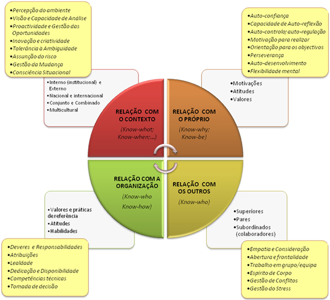 – A relação com o Próprio – Know-why, Know-be (perspectiva intra-individual), onde destacamos as orientações vocacionais, as convicções, as atitudes e os valores pessoais;