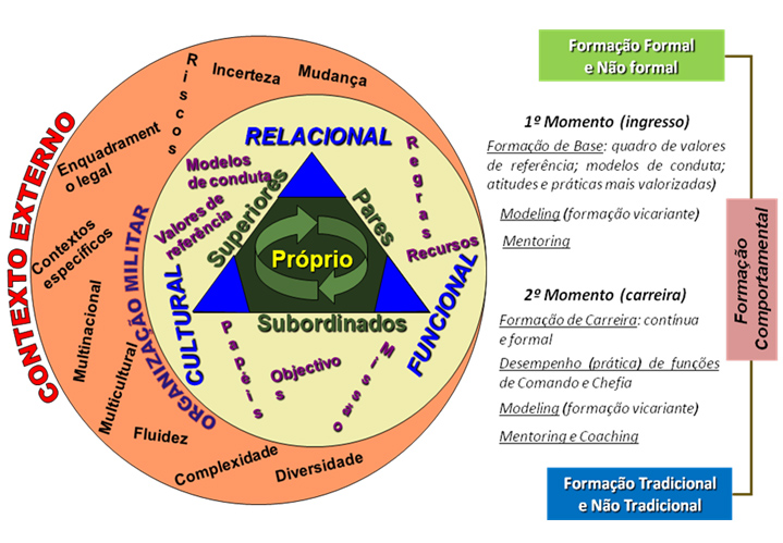 Considerando que os cursos de formação inicial constituem, na generalidade, condição de acesso aos QP das diversas categorias, bem como ainda um momento de integração na cultura organizacional, este “momento” deverá ser privilegiado no modelo de formação comportamental. No entanto, se atendermos a toda a carreira, a que está associada uma panóplia de cargos e diferentes tipologias de funções, com uma complexidade e responsabilidade crescentes ao longo do percurso profissional, poderemos ter que admitir, embora com outras finalidades, a continuidade do processo formativo na sua dimensão comportamental, de molde a preparar os militares para os novos e sucessivos desafios. Quando se trata de militares da categoria de oficiais, pelo facto de assumirem responsabilidades de direção e chefia aos mais altos níveis da hierarquia, esta componente comportamental deve incorporar outras solicitações e exigências que geralmente estão associadas a tomadas de decisão sob pressão do tempo e à resolução de problemas em condições limite, designadamente, no âmbito da gestão de recursos. Neste caso, admite-se, com maior frequência, o recurso à autorreflexão e à autoaprendizagem e, por isso, à dimensão “relação com o próprio”, encontrando-se o comandante/chefe militar muitas vezes isolado (decorrente da natureza do próprio exercício da liderança a esses níveis) e assumindo a responsabilidade por inteiro, ainda que assessorado pelo seu estado-maior.