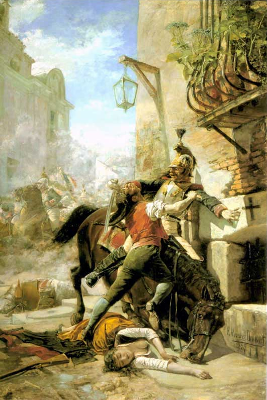 Mais do que mostrar a fúria e o drama pessoal de um pai, a pintura de Álvarez Dumont encerra um nível simbólico: respeita ao levantamento popular contra a dominação napoleónica que teve início na capital espanhola, no dia 2 de Maio de 1808. A revolta madrilena apanhou de surpresa as forças ocupantes e, em boa medida, também os próprios sublevados3. A resposta francesa empurrou os insurrectos para as zonas rurais fora dos grandes centros habitacionais, mas nunca foi capaz de os erradicar ou, sequer, de impedir o seu crescimento. Não obstante a dura repressão a que foi submetida4, esta rebelião popular alastrou para muitas outras regiões de Espanha acabando por contribuir para a derrota francesa e para a restauração borbónica que se lhe seguiu.