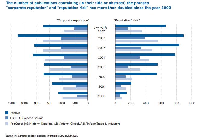 Nos últimos anos tem sido explorado por diversos autores o constructo reputação. Tonello, em 2007 (p. 5), para evidenciar o aumento, desde 2000, do número de trabalhos cujo título ou o resumo tinham as palavras “corporate reputation” e “reputation risk”, referencia um estudo conduzido pelo “the conference board business information service” (Figura 1).