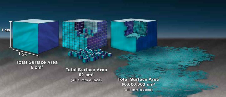 Quando 1cm3 é subdividido em partículas (1021 cubos) com 1 nanómetro (nm), cada uma com uma área de 6nm2, a área total de cobertura será de 6,000 m2 – superior à área de um campo de futebol. Esta capacidade dos materiais nanoestruturados traduz-se em incrementos substanciais de reatividade com aplicação em catalisadores, e de enormes vantagens na indústria química, têxtil e farmacêutica.