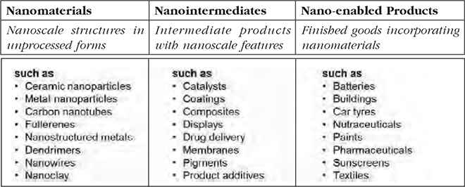 A antevisão da U.S. National Nanotechnology Initiative (NNI)[11], apontou quatro gerações de produtos resultantes do seu desenvolvimento: a primeira, designada de nanoestruturas passivas, é composta por revestimentos, nanoparticulas, aerossóis, polímeros, compósitos, nanoestruturas e cerâmicas; a segunda, designada por nanoestruturas ativas, é composta por produtos com efeitos bio-ativos (drogas dirigidas, sensores e bio-devices) e físico-químico ativos (amplificadores, atuadores, estruturas adaptativas…); a terceira, atualmente em desenvolvimento, é composta por sistemas de nanosistemas (novas arquiteturas hierárquicas, robótica, sistemas evolucionários…); a quarta, prevista para o período de 2015 a 2020, deverá incluir dispositivos resultantes de manipulação molecular, atomic design e outras funções emergentes.
