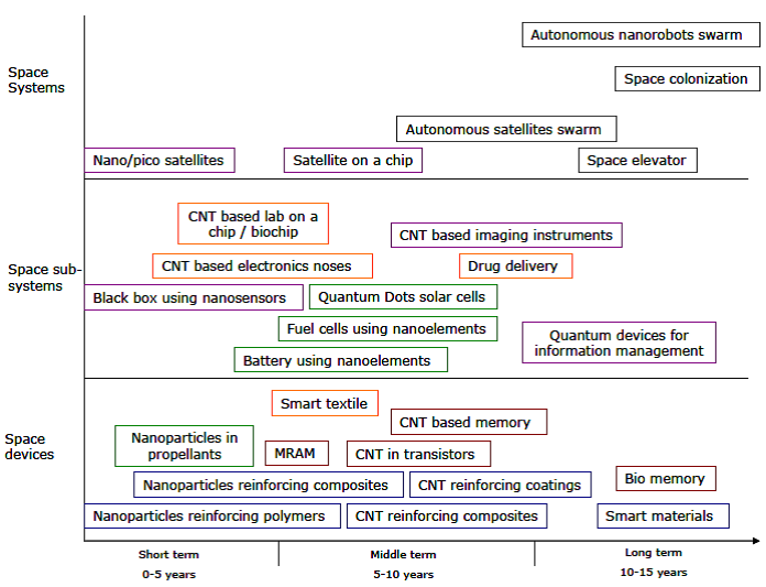 A libertação de partículas pode ocorrer em resultado de uma utilização normal (abrasão) ou por acidente. Enquanto na indústria aeronáutica a maior preocupação está dirigida para as nanopartículas libertadas pelas aeronaves na atmosfera, com eventual contaminação da água ou dos solos, no caso do espaço está especialmente dirigida aos danos nos astronautas causados pelos longos períodos de exposição em espaços ultra-confinados. A figura seguinte é a representação gráfica duma antevisão alargada para aplicações da nanotecnologia nos domínios da atividade espacial dirigida para materiais, energia, eletrónica, sistemas apoio à vida no espaço e plataformas para investigação científica…