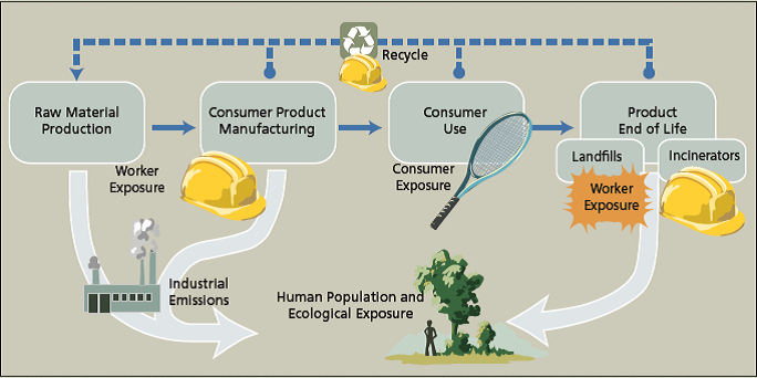 Os riscos potenciais para a saúde e ambiente estão principalmente associados ao ciclo de produção, à transformação ou tratamento de resíduos e ações de alienação ou reciclagem.