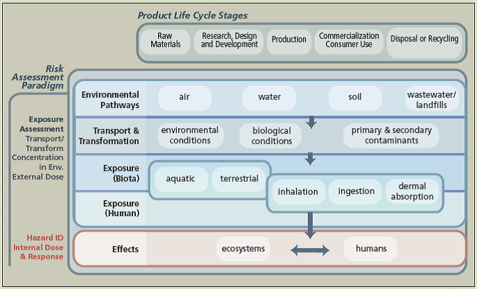 A avaliação do ciclo de vida do nanomaterial complementa esta metodologia garantindo oportunidades adicionais para a identificação e redução dos riscos e efeitos adversos da NT. O referido ciclo considera as fases de produção, exploração e despejo, ou reciclagem do produto. O percurso desde a extração até ao fim de vida está caraterizado na figura 8, enquanto o paradigma da avaliação de risco com os diversos fatores é esquematicamente representado na figura 9.