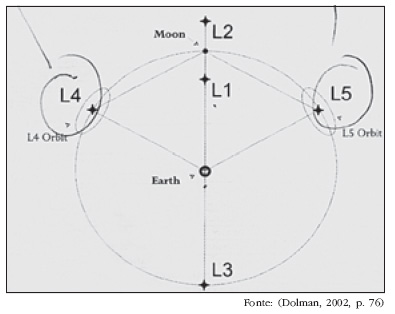 Ainda relacionado com o fenómeno da gravidade e localizados nos espaços terrestre e lunar, é imperioso determo-nos nos cinco Lagrange 30 Libration Points, identificados na figura 2, onde os efeitos gravitacionais da Terra e do seu satélite natural se anulam mutuamente permitindo que, em tese, um objecto orbitando na vizinhança desses pontos permaneça estável e sem consumo de combustível. Na prática, a estabilidade só existe em dois desses pontos, o que vem aumentar a sua importância; por agora será especulativo, mas o potencial valor militar e comercial de um terreno com estabilidade no Espaço é certamente enorme31.