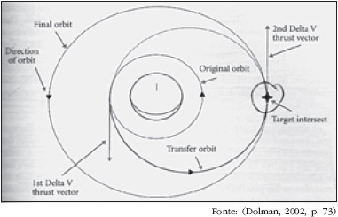 Pelo que foi dito anteriormente, pode-se concluir que a viagem espacial mais eficiente será aquela em que as órbitas utilizadas sejam estáveis e que a transferências entre elas sejam efectuadas, consumindo a menor quantidade de combustível possível, isto é, utilizando a transferência de Hohmann33, ilustrada na figura 3. Esta é a técnica menos consumista e com menor desgaste utilizada para as transferências34.