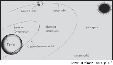 De acordo com Everett Dolman, verificando das alterações à equação global do Poder ou das dinâmicas de Poder, provocadas pelo acesso e exploração dos recursos espaciais e pelo futuro desenvolvimento do transporte no Espaço51 e, considerando como base científica as propriedades físicas, o Espaço pode ser dividido em quatro regiões astropolíticas perfeitamente distintas, como se mostra na figura 4, que do nosso ponto de vista, podem materializar um modelo de dinâmica de Poder ou uma sua aproximação: a Terra, o Espaço Terrestre, o Espaço Lunar e o Espaço Solar.