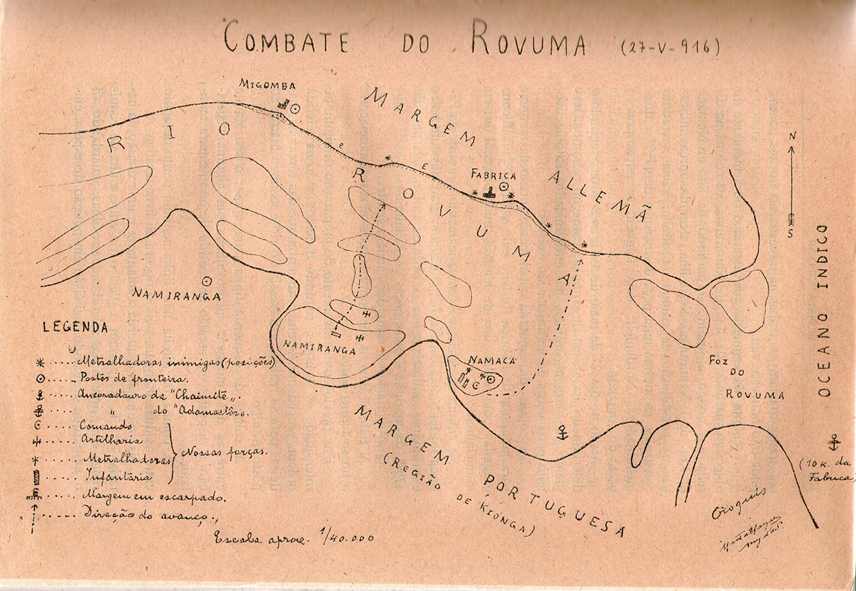 No dia 15 de agosto tinha sido feito o reconhecimento aos vaus do Rovuma para a futura passagem das colunas tendo sido decidido utilizar os vaus denominados de Nacôa, Namoto e Quionga. A 29 do mesmo mês, deu-se a defesa de Negonamo (Costa, 1930: 369). Este posto, colocado na confluência entre os rios Lugena e Rovuma, foi palco de dois importantes combates durante a Grande Guerra (29 de Agosto de 1916 e 25 de Novembro de 1917). Vamos referir o de 1916.