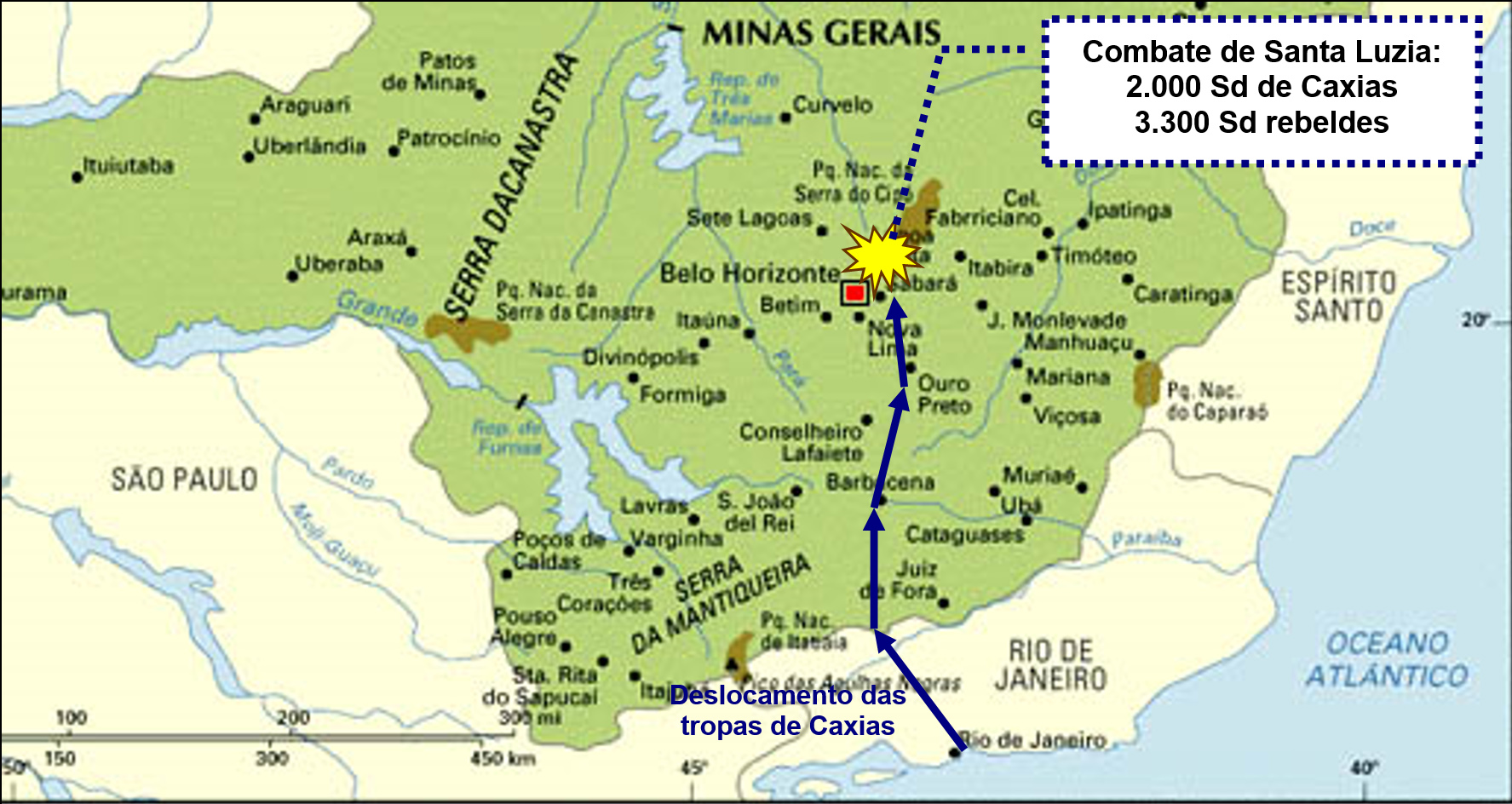 As forças do Barão de Caxias rapidamente se deslocaram do Rio de Janeiro para Ouro Preto, onde chegaram após, apenas, onze dias de marcha forçada, via Valença e Paraíba do Sul. A parada da coluna revoltosa em Santa Luzia permitiu que Caxias reunisse mais tropas procedentes da capital.