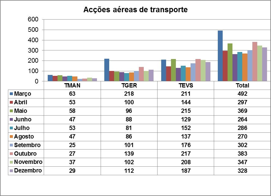 Vamos agora analisar as missões de transporte muito relevantes no abastecimento dos quarteis do Exército. No que diz respeito a estas missões, a quebra é evidente até Setembro aumentando a partir daí, embora nunca se alcance o número de acções registado em Março. A redução é mais significativa nas missões TGER, importantes no abastecimento das diversas unidades do Exército espalhadas pela colónia.