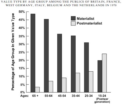 As diferenças são evidentes. Entre os que tinham mais de 65 anos, os valores materialistas ultrapassavam doze vezes os pós materialistas. Entre os que tinham nascido após a II Guerra Mundial (que tinham menos de 25 anos em 1970), os que aderiam a valores pós materialistas eram ligeiramente superiores aos que aderiam a valores materialistas. O estudo veio a revelar que, em 2006, os pós materialistas eram ligeiramente superiores aos materialistas na Europa Ocidental e duas vezes superiores nos EUA. Apesar de substanciais e rápidas flutuações e condições económicas desfavoráveis nos anos recentes, houve uma nítida transferência de valores materialistas para pós materialistas.