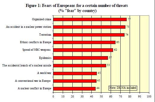 • Uma opinião pública que cada vez mais privilegia a segurança, favorecendo medidas preventivas, esquecendo a defesa e a coação, como forma limite de conseguir segurança. Uma sondagem de opinião pública, recente, na Europa, mostra‑nos o que os europeus mais temem para a sua segurança. Como se verifica, de dez ameaças que se relacionam com segurança e defesa as três coisas que os europeus mais temem, numa sondagem recente, são riscos não militares (crime organizado, 77%, um acidente com uma instalação nuclear, 75%, e o terrorismo, 74%). Os riscos menos percebidos são um conflito nuclear na Europa (44%), uma guerra convencional na Europa ou uma guerra mundial (45%).