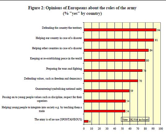 De acordo com estudos recentes de sociologia militar a ligação das forças armadas à nação é influenciada por dois fatores principais: o sentimento de identidade nacional (patriotismo) e a perceção das ameaças. O quadro seguinte, baseado na mesma sondagem, mostra‑nos como os europeus sentem a função da sua força armada. Das quinze nações europeias consultadas, 94% das suas populações consideram que a sua missão primária é a defesa do território, seguida da missão de auxiliar em desastres nacionais (91%), colaborar em missões humanitárias (84%), auxiliar a manter a paz global (80%), defender valores tais como a liberdade e a democracia (70%), ou garantir a identidade nacional (59%).